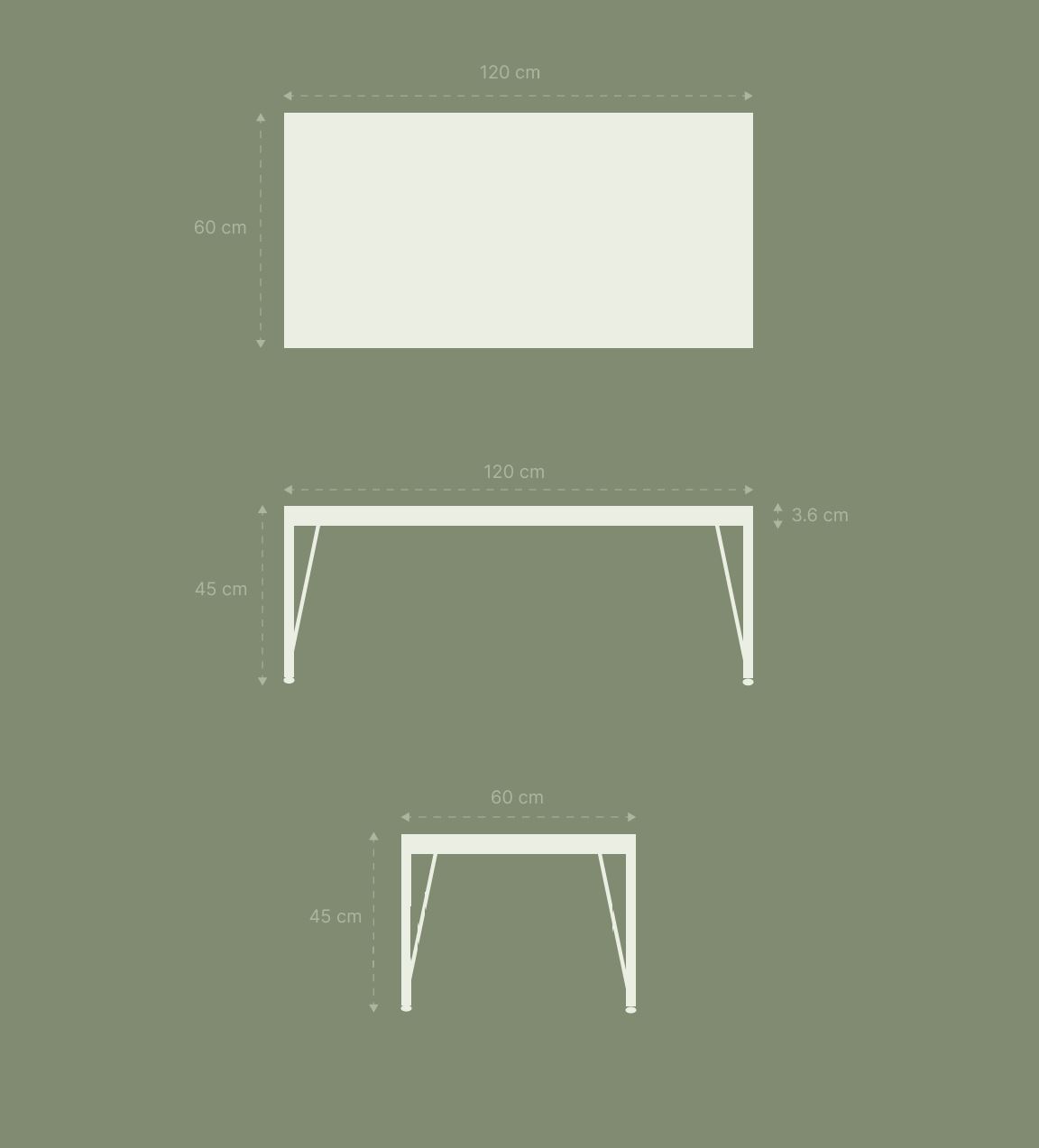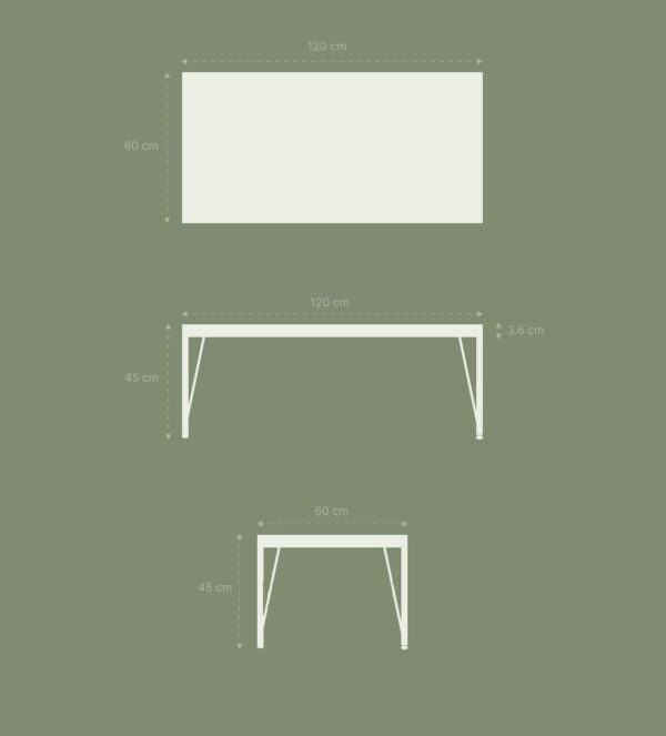 120 cm x 60 cm (sipërfaqja e sipërme) Lartësia: 45 cm Trashësia e sipërfaqes: 3.6 cm